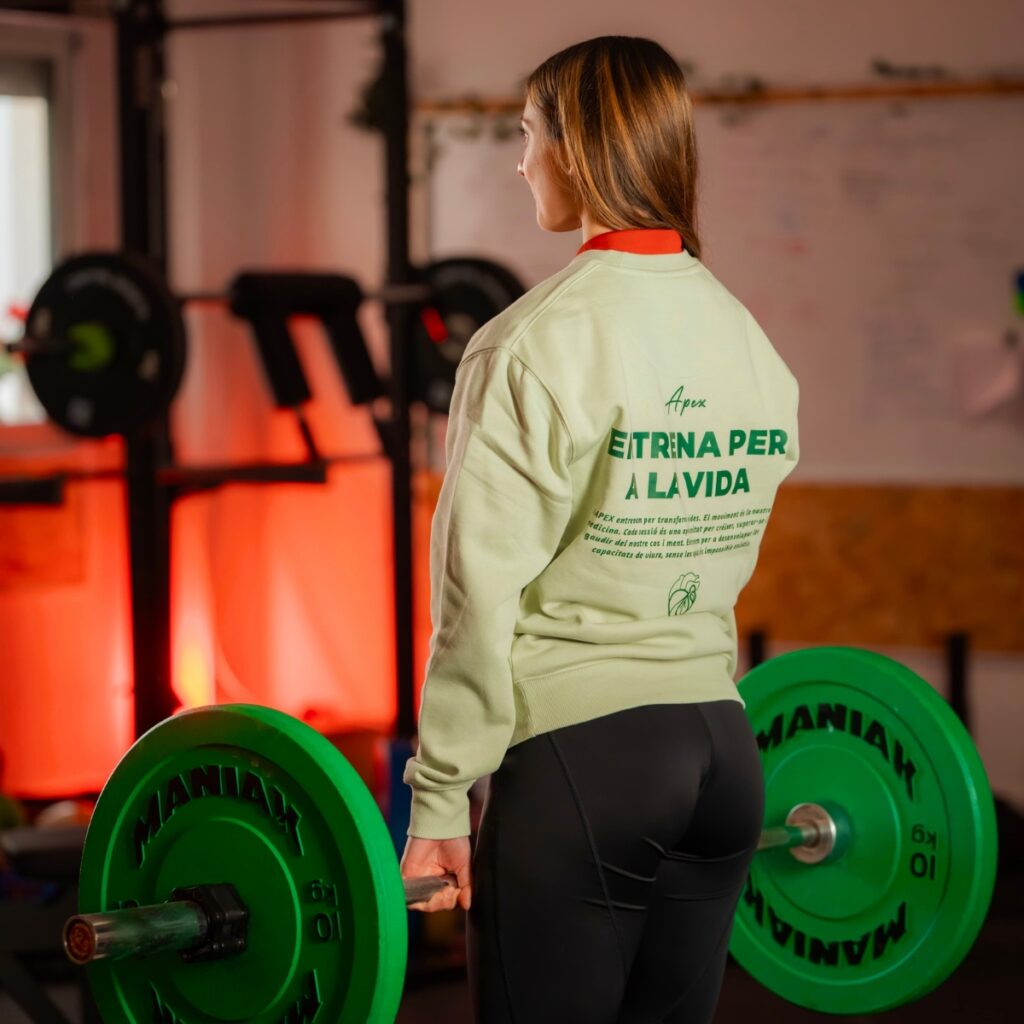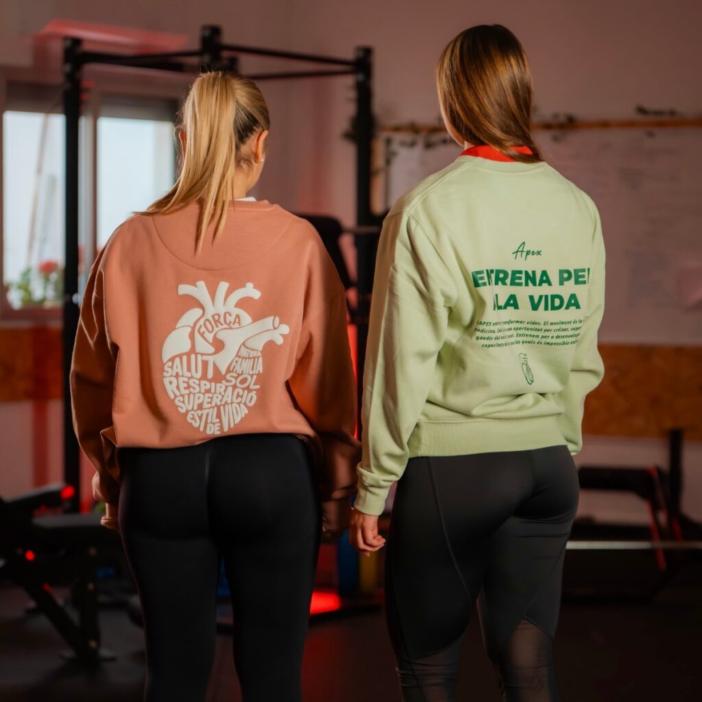 – La prenda verde corporativa luce el mensaje icónico de APEX: “Entrena per a la vida”, acompañado de su filosofía de movimiento, bienestar físico y mental.